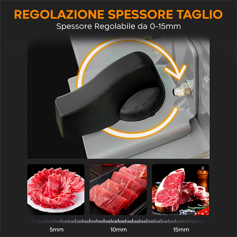 L’Affettatrice Elettrica Erice è dotata di una regolazione dello spessore fino a 15 mm, che ti permette di personalizzare ogni fetta in base alle tue esigenze: sottilissima per i carpacci o più spessa per formaggi stagionati.
