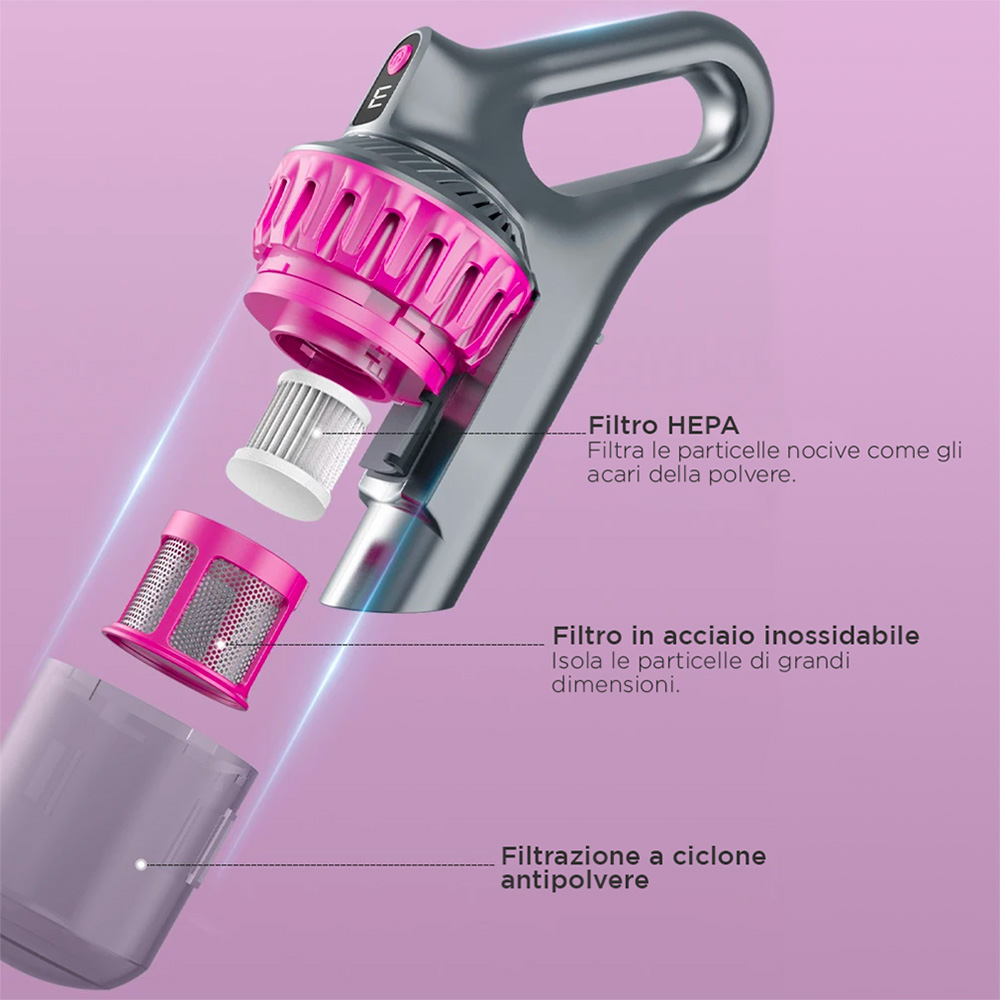 Liberati dall'ingombro dei fili e trasforma la tua routine di pulizia in un'esperienza senza sforzo. Con il nostro aspirapolvere senza fili 4 in 1 puoi affrontare qualsiasi tipo di sporco con la massima facilità e versatilità, da pavimenti a divani, dalle auto agli angoli difficili da raggiungere. Con la potenza di aspirazione da 100W e il filtro HEPA avanzato, respirerai aria fresca e pulita mentre la tua casa risplende di pulizia.