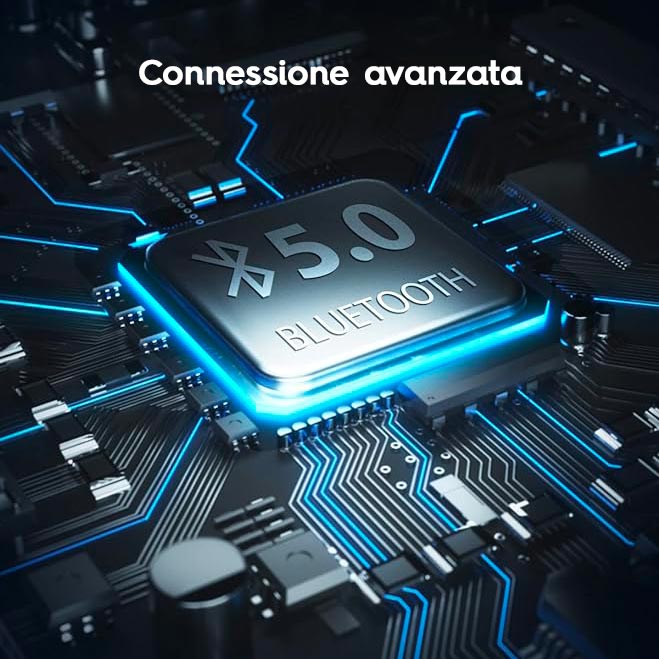 Tramite la connessione Bluetooth 5.0, puoi godere di una connessione stabile e affidabile, consentendoti di ascoltare la tua musica preferita e gestire le chiamate senza alcun intoppo. La velocità di trasmissione dati superiore e la maggiore copertura permettono di mantenere una connessione costante anche durante i viaggi più avventurosi.