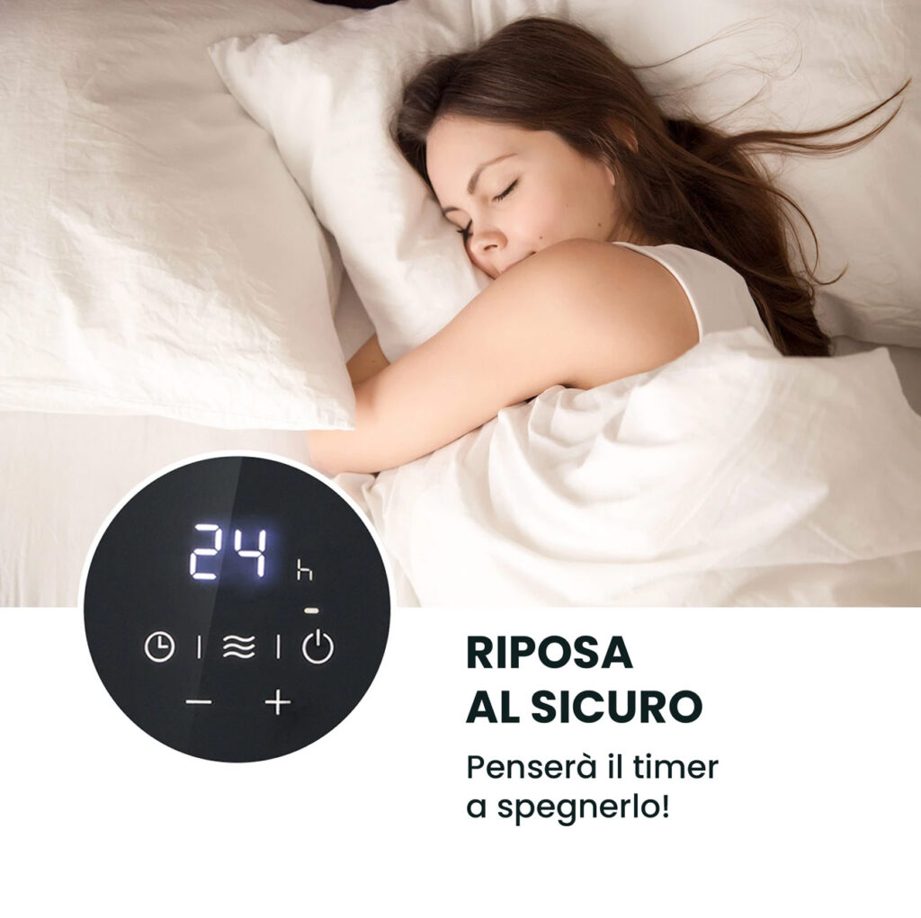 Con il suo timer integrato, potrai programmare l’accensione e lo spegnimento automatico per risvegliarti in una stanza già calda o tornare a casa e trovare un ambiente accogliente, senza dover pensare al riscaldamento.