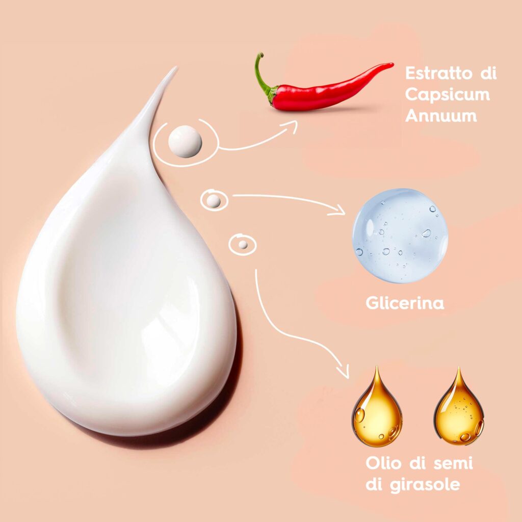 Estratto di Capsicum Annuum: Estratto pregiato derivato dai peperoncini, questo ingrediente conferisce al prodotto un efficace effetto riscaldante e un’azione iperemica, fornendo sollievo rapido dai dolori.