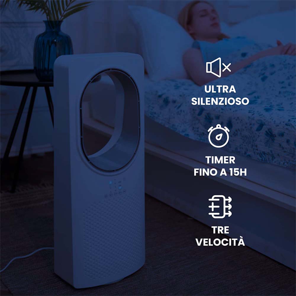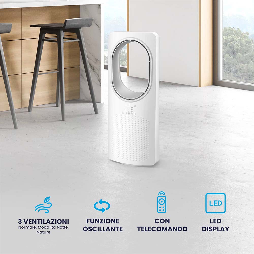 Sono davvero soddisfatto di questo ventilatore senza pale, il design è elegante si adatta perfettamente al mio arredamento moderno. Il flusso d’aria è costante e piacevolmente uniforme, senza fastidiose sensazioni di vento diretto.