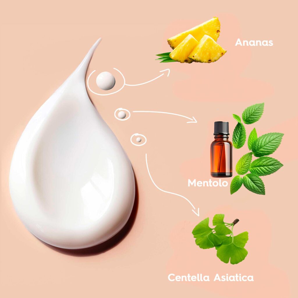 Acqua, glicerina, etilhexil stearato, ceteareth-25, stearato di glicerile, alcool cetearilico, profumo, acrilati/c10-30 alchil acrilati crosspolimero, estratto di frutta di ananas sativus, estratto di centella asiatica, imidazolidinile urea, sodio deidroacetato, edta disodico, mentolo, acetato di tocoferile, idrossido di sodio