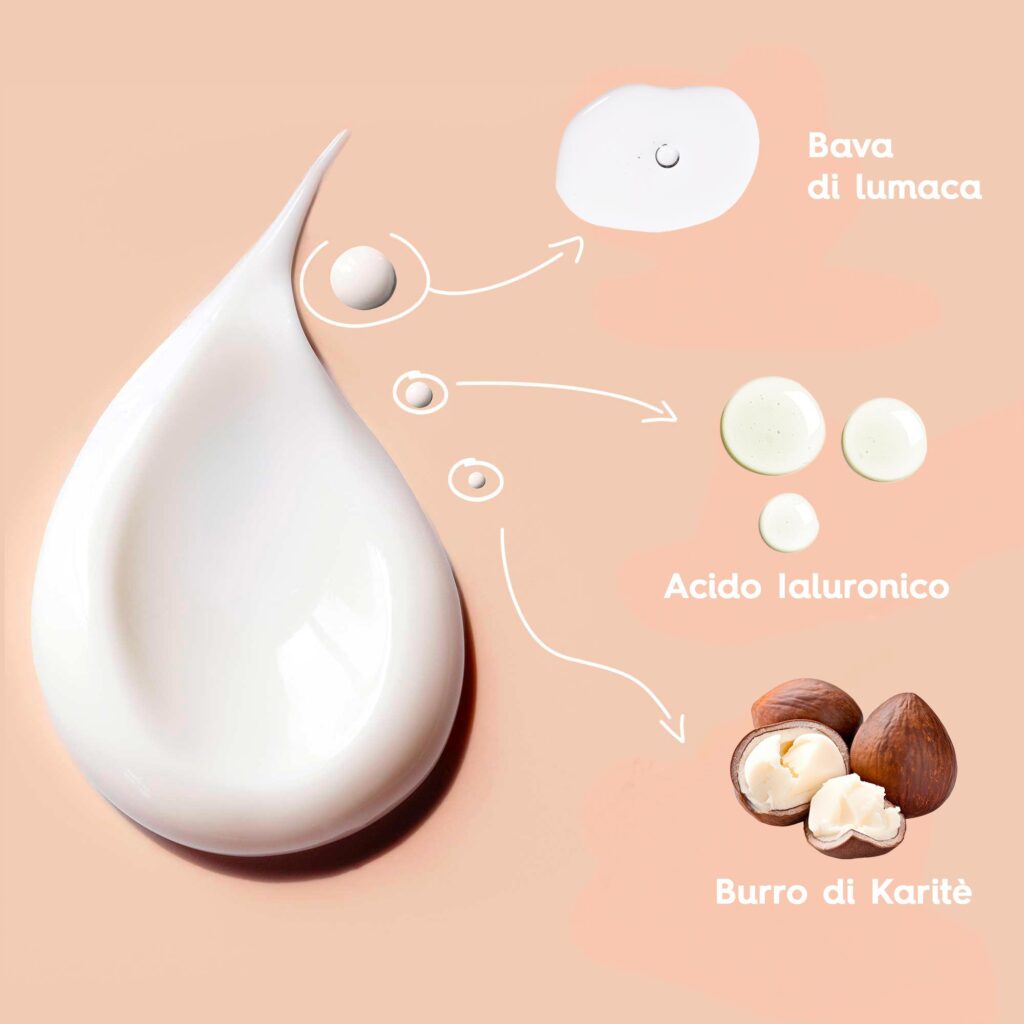 Acqua, Trigliceridi Caprilici/Caprili, Glicerina, Alcol Cetilico, Ceteareth-25, Stearato di Glicerile, Etilestere di Glicerile, Burro di Karitè (Butyrospermum Parkii), Crosspolimero di Ialuronato di Sodio, Diisostearato Poligliceril-4/Poliidrossistearato/Sebacato Poligliceril-4, Isostearato di Sodio, Alcol, Profumo, Gomma di Xantano, Crosspolimero di Acrilati/Acrilato di Alchil C10-30, Silice, Urea Imidazolidinil, Ciclopentasilossano, Deidroacetato di Sodio, EDTA Disodico, Allantoina, Olio di Mandorle Dolci (Prunus Amygdalus Dulcis), Acetato di Tocoferile (Vitamina E), Filtrato di Secrezione di Lumaca, Fosfato di Ascorbile di Sodio (Vitamina C), Acideo Citrico.