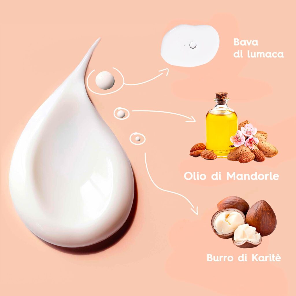 Acqua, Trigliceridi Caprilici/Caprici, Glicerina, Alcol Cetilico, Ceteareth 25, Gliceryl Stearato, Etilestere Etile, Burro di Karitè (Butyrospermum Parkii), Profumo, Gomma di Xantano, Polimero Incrociato di Acrilati/C10-30 Alchilacrilato, Silica, Ciclopentasilossano, EDTA Disodico, Allantoina, Olio di Mandorle Dolci (Prunus Amygdalus Dulcis), Tocoferil Acetato, Filtrato di Secrezione di Lumaca, Benzoato di Sodio, Sorbato di Potassio, Acido Citrico.