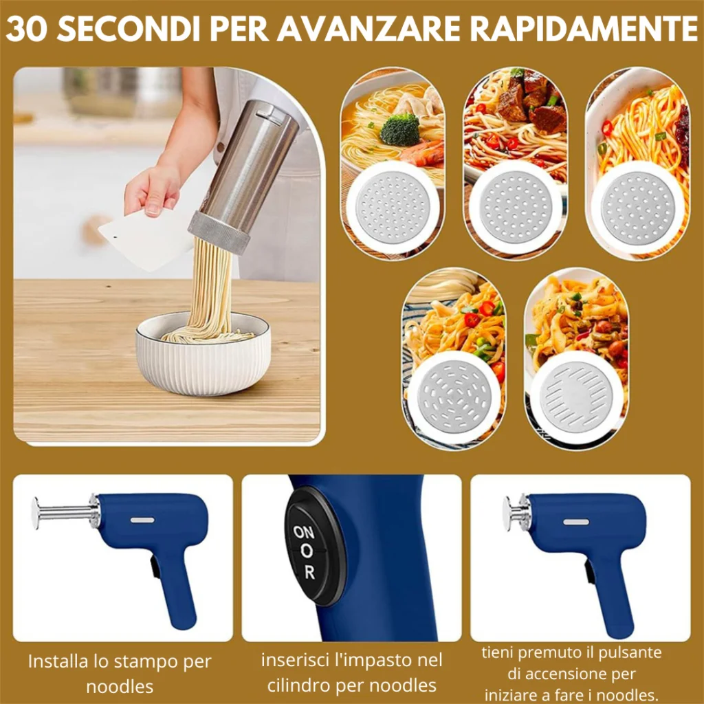 Grazie alla sua tecnologia avanzata e alla batteria ricaricabile, puoi ottenere pasta fatta in casa in meno di 30 secondi, senza bisogno di cavi o prese di corrente. La possibilità di cambiare gli stampi ti consente di personalizzare ogni ricetta in base alle tue preferenze.