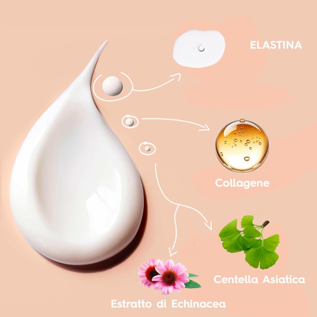 ELASTINA: Una proteina essenziale per la pelle che conferisce elasticità e resistenza ai tessuti, lavora per migliorare la tonicità della pelle, contribuendo a ridurre l’aspetto dell’effetto “cuscinetto” e a conferire una sensazione di compattezza.