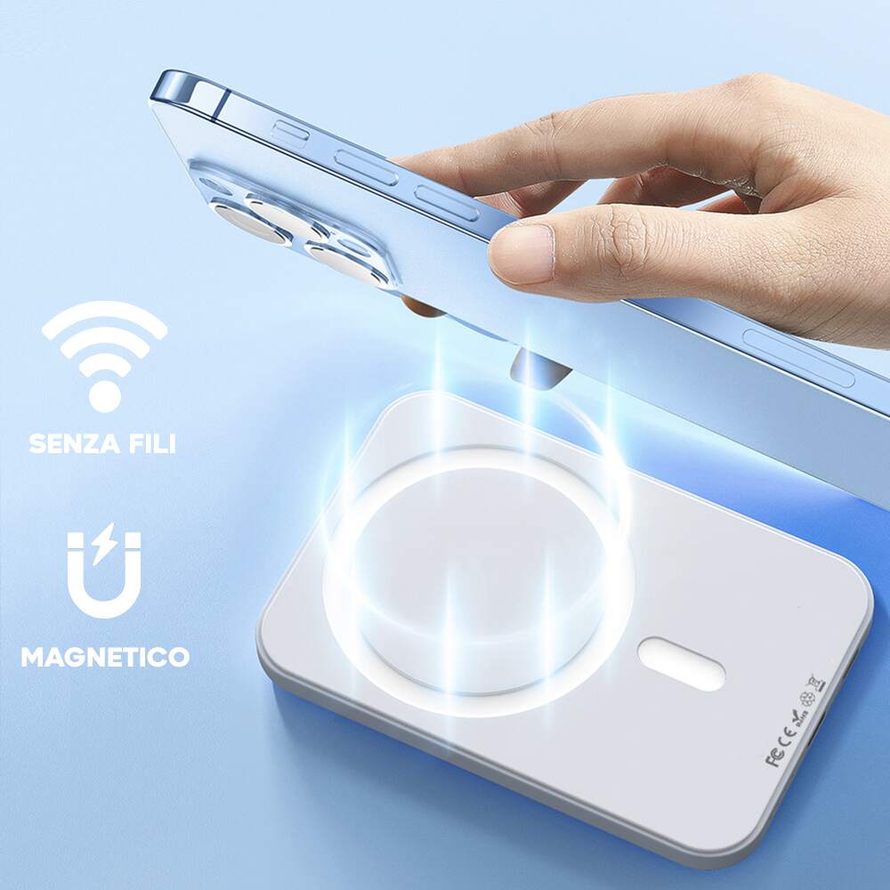 Dimentica i cavi e i connettori scomodi. Basta appoggiare il nostro Powerbank wireless magnetico sul retro del tuo iPhone serie 12/13/14 e il telefono si caricherà automaticamente. Nessuna scivolata, solo una ricarica comoda e sicura!