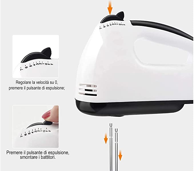 Il nostro sbattitore è progettato per rendere l’utilizzo facile e sicuro. L’interruttore di accensione ti permette di attivarlo con un semplice gesto, mentre il pulsante di espulsione delle fruste rende il cambio rapido e sicuro. La presa maneggevole ti offre un controllo perfetto durante la miscelazione.