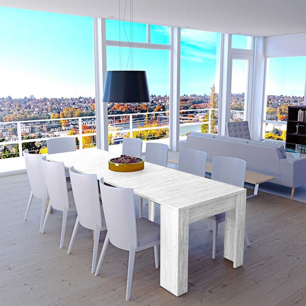 Posso adattarlo alle diverse occasioni senza alcuna fatica. Quando ho bisogno di uno spazio extra, basta estenderlo e diventa un tavolo da banchetto. E quando non è in uso, si chiude in modo compatto e le allunghe sono riposte all’interno, liberando spazio prezioso.