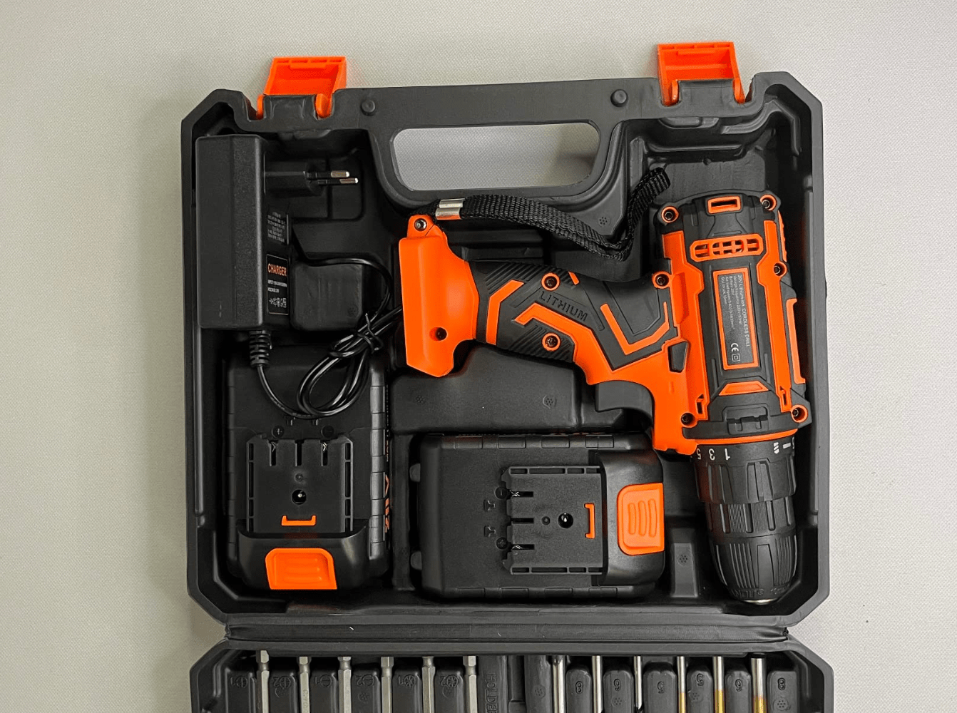 Mocna wiertarko-wkrętarka akumulatorowa, kompletna z walizką, akcesoriami i 2 bateriami o długiej żywotności.