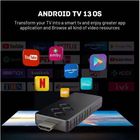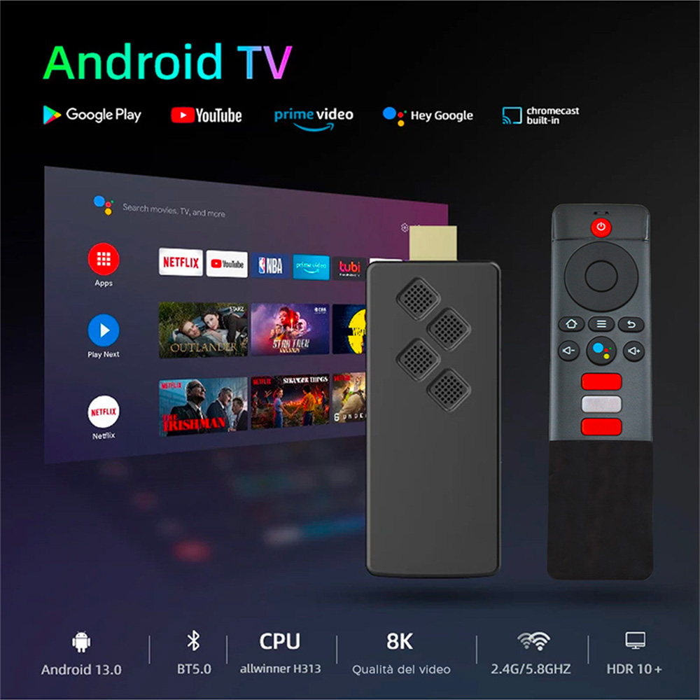 Il TV Box Stick – Android 8K Ultra HD ti offre un accesso rapido e immediato ai tuoi contenuti preferiti grazie alla sua tecnologia avanzata e al processore ad alte prestazioni. Facile da usare e dal design compatto, trasforma qualsiasi televisore in una Smart TV in pochi secondi.