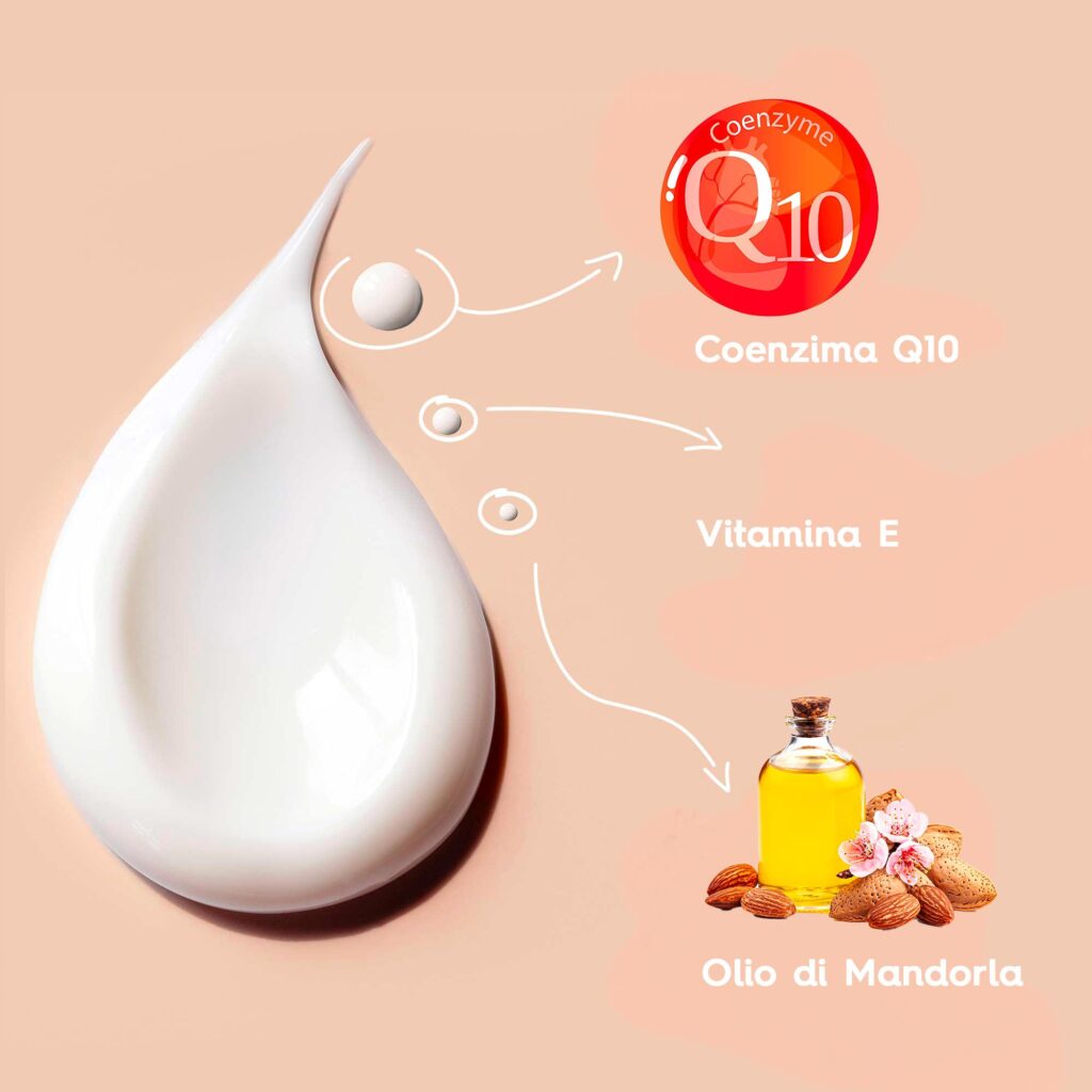 Acqua, Trigliceridi Caprilici e Caprici, Glicerina, Alcol Cetearilico, Ceteareth 25, Stearato di Glicerile, Stearato di Etilesile, Burro di Karité (Butyrospermum Parkii), Profumo, Gomma di Xanthan, Acrylates / C10-30 Alchil Acrylate Crosspolymer, Silice, Ciclopentasilossano, EDTA Disodico, Allantoina, Olio di Mandorle Dolci (Prunus Amygdalus Dulcis), Acetato di Tocoferile (Vitamina E), Ubiquinone (Coenzima Q10), Benzoato di Sodio, Sorbato di Potassio, Acido Citrico.